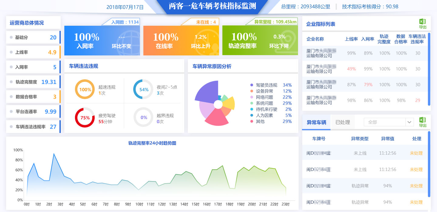 2019年11月,我司在福建省廈門市建設了廈門市重點營運車輛行業(yè)監(jiān)測處置系統(tǒng),該項目采用統(tǒng)一的車載終端標準和動態(tài)監(jiān)管平臺,采集全市重點營運運輸車輛數(shù)據(jù),將運輸企業(yè)基礎(chǔ)數(shù)據(jù)和車輛行駛等動態(tài)數(shù)據(jù)納入監(jiān)管系統(tǒng)并進行綜合處理分析,并接入車載主動安全報警數(shù)據(jù),實現(xiàn)全流程閉環(huán)管理。同時,系統(tǒng)引用省廳考核機制,將共享車輛違規(guī)數(shù)據(jù)反饋給企業(yè)及運營商,以此建立企業(yè)和運營商同步指標考核機制,促進監(jiān)管與服務同步發(fā)展,將單一的管控平臺轉(zhuǎn)化為監(jiān)管與服務一體化的全方位平臺。