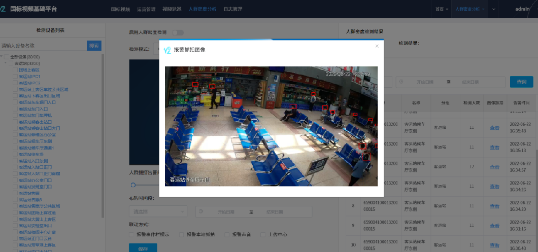 平臺在統(tǒng)一視頻資源匯聚管理的基礎(chǔ)上,依托智能邊緣設(shè)備的視頻識別技術(shù),實現(xiàn)客運站點的人群密度檢測及告警。當客運站點人數(shù)超過自定義閾值后,自動抓拍并預(yù)警提醒,用于監(jiān)控區(qū)域內(nèi)人群數(shù)量及密度的動態(tài)變化,為交通管理部門的指揮調(diào)度提供科學支撐。