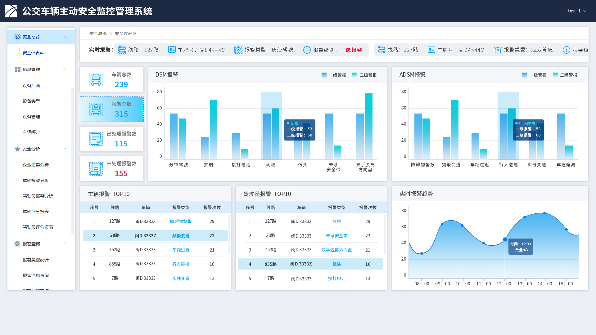 公交車輛主動安全監(jiān)控管理系統(tǒng)支持接入駕駛行為分析設(shè)備(DSM)、前向安全設(shè)備(ADAS)、盲區(qū)監(jiān)測設(shè)備(BSD)、車身姿態(tài)檢測設(shè)備(VADS)和多路視頻監(jiān)控系統(tǒng),形成對駕駛員、車輛異常情況的全面監(jiān)控,并對數(shù)據(jù)進行實時的分析統(tǒng)計和挖掘計算,提供智能化的信息和服務(wù),平臺支持國標、與各省團體標準協(xié)議的接入。