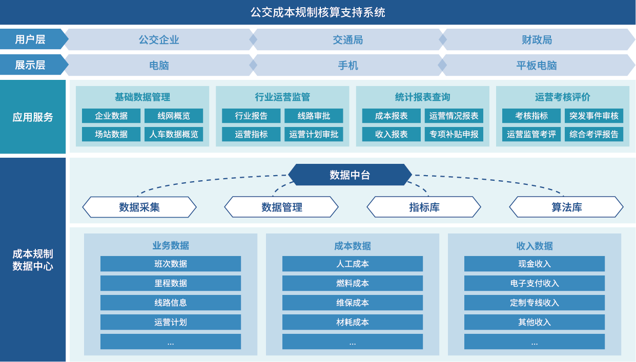 公交成本規(guī)制核算支持系統(tǒng),是輔助政府核算應(yīng)承擔(dān)公交財政補貼數(shù)額的應(yīng)用系統(tǒng)。系統(tǒng)對政府規(guī)制的公交企業(yè)成本與營收進行分類匯總,并建立城市公交單位運輸成本與運營考核評價體系,以此測算財政補貼數(shù)額和評價公交企業(yè)經(jīng)營狀況。以促進公交企業(yè)進行成本控制、規(guī)范營收,約束不合理的公交成本增加和投入,保證在規(guī)定的財政補貼下公交企業(yè)能夠可持續(xù)發(fā)展。
