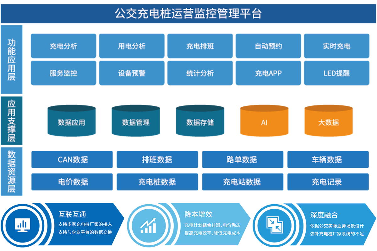 公交充電樁運營監(jiān)控管理平臺集合公交企業(yè)所有充電樁資源,通過大數(shù)據(jù)分析技術(shù),為充電樁的運營、運維提供數(shù)據(jù)預(yù)測、分析服務(wù),提高公交車輛充電效率,降低用電、運維成本。本平臺與車輛智能調(diào)度系統(tǒng)深度結(jié)合,具備針對公交公司業(yè)務(wù)的特色功能,有效彌補充電樁廠家管理系統(tǒng)的不足,實現(xiàn)車輛充電管理和排班調(diào)度的業(yè)務(wù)融合(充電?用電?用電分析?計劃優(yōu)化?再充電),有效提升管理效率和營運水平。